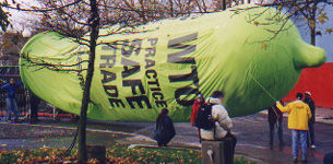 January 1, 1995 saw the formation of the World Trade Organization. Though most people are familiar with this name, few actually know what how it will affect them. The WTO is an international body that regulates international trade and trade disputes, and is made up of 135 member countries, including Canada. Even this description has most people, wondering, "Why should I care?" As a citizen of this world, pretty much every trade decision made globally will affect you; and as organizations such as the WTO make the world of trade smaller and smaller, the effects become more drastic. How does the WTO impact on Canadians? The WTO is one of the forces which is making consumer goods cheaper. This sounds fairly positive, doesn't it? But, you need to look past the surface, short-term benefits and see how this is done. Instead of manufacturing products in Canada, where minimum wage can be as high as $7.50 per hour, the products are manufactured in places like China, where factory labourers do the work for often less than $7.50 per week. Yet many people still say, "Why should I care? Those people live millions of kilometers away, everyone there is poor, they are used to it." It's not true that it doesn't affect Canadians, in fact, these practices have huge impacts on Canadians. Thing about all the people in Canada who could have worked in those factories? They are out of jobs. Still not convinced the WTO's actions will affect you? In Canada, we have public health and welfare programs like universal health care and public schooling. But these types of programs may not survive the WTO. The WTO sees public funding of such programs as a "barrier" to companies from other countries who want to sell to Canadians. If the WTO had it's way, private corporations would be able to "compete" for "consumers" of health and education in Canada. Mega-corporations aren't getting their fair chance to squeeze money out the citizens of the world. The possibilities of what the WTO could do are endless: -open up Canadian water for mass export -end funding of cultural subsidies (which means that the fragile culture Canada has managed to save from the American cultural dominance could vanish altogether). -put an end to tariffs (tariffs give domestic products a chance to have comparable pricing and also help to control things like deforestation and the killing of endangered species by taxing foreign products as they enter the country) - disallow countries to deny trade with other countries (based on human rights records, environmental issues, etc.). For example, Massachusetts had a law that prevented government contracts from being given to companies doing business with Burma, because of Burma's horrible record on human rights. Under a WTO ruling, Massachusetts had to abandon this law. Think of this - as of October 1999, not a single democratically decided upon health or environmental regulation which was suggested as a trade barrier had remained in place. Not one. Here's two examples from the Council of Canadians website of what kinds of "trade barriers" are being removed: "Recently, for instance, the European Union was ordered to lift its ban on beef containing artificial hormones. The WTO ruled the ban, designed to protect public health, is an illegal barrier to trade. Even the powerful U.S. government was forced to withdraw provisions of its Clean Air Act when the WTO ruled that gasoline cleanliness standards Washington had set violated trade rules." These examples show another scary side to the WTO. The WTO has the authority to strike down laws and policies that are made by democratically elected governments. The WTO has the ability to back-up its decisions (made by an unelected panel of trade bureaucrats, in secret) with the threat of trade sanctions and fines &endash; to keep member countries toeing the line. At the heart of the protests against the WTO, is the protest against this threat to democracy. So, if we've convinced you just a little bit, and you want to inform yourself and take action as these activists have, contact Check Your Head at: cyh@axion.net Or contact these other associations