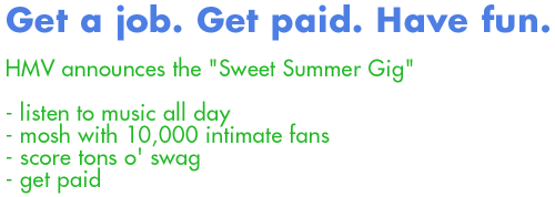 S-W-E-E-T! Summer is finally here, school's out and teens have two months of summer fun to look forward to. For those looking to shake-up their summer, HMV is running a contest giving teens the schange to win one of six "Sweet Summer Gigs"--a paid summer job with HMV for a behind-the-scenes look at the music industry. Winning teens will be the envy of their friends by becoming the ultimate music guru. They'll have the opportunity to work with HMV at one of Canada's coolest record stores or at the company's head office in Toronto. In addition to learning what it's like to work in a music store or online at HMV.com, the winning teens might also get the chance to hang backstage and check out some of the coolest concerts this summer. How does it work? Interested teens over the age of 16 can visit any HMV store and pick up a mail-in postcard or log on to www. HMV.com to enter the contest for their chance to win. The contest runs from now until July 2, 2000. Sound easy? You bet it is. In addition to filling out the essentials, entrants must state why they want to win, in 25 words or less. All entrants must be eligible for employment based on HMV criteria and legal qualifications. On July 3, 2000, six entries will be selcted in a random draw: two from the Western provinces, two from Ontario and two from Quebec/Maritimes and contacted by telephone to see if they qualify for the prize. Interested entrants must reside in a market where there is an HMV location and the contest is open to residents of Canada only. Win Big: One lucky winner and guest go to London, England HMV offers the chance to win not only a paid summer job...but one of the qualified lucky six selected will be chosen in a second random draw, to go to London, England to see Savage Garden and Destiny's Child live in Concert July 9, 2000. |